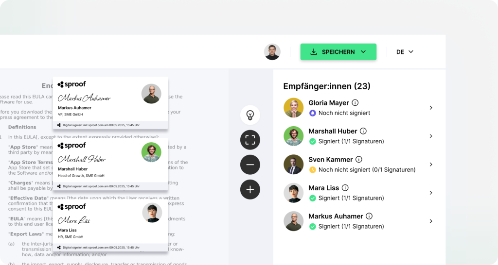Steigern Sie Effizienz und Rechtssicherheit mit sproof sign. Definieren Sie komplexe Signatur-Workflows, laden Sie Partner zur qualifizierten Unterschrift ein und beschleunigen Sie Ihre Geschäftsprozesse – einfach, sicher und rechtskonform.