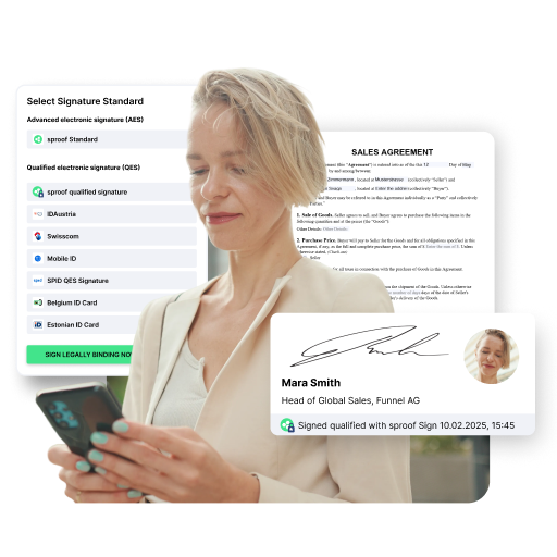 sproof supports all internationally valid standards for electronic seals and signatures. The security level (EES, FES, QES) can be flexibly adapted depending on the application and supplemented with additional security factors depending on the use case. For internal processes and external contracts, always eIDAS-compliant and with maximum evidential value.
