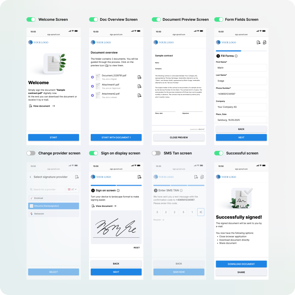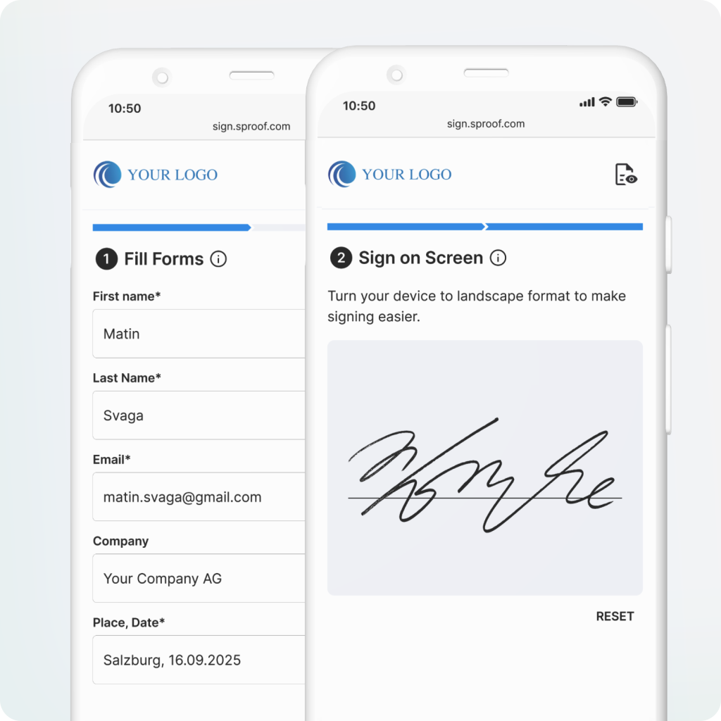 Proof Fastlane je maksimalno poenostavljen digitalni postopek za zbiranje pravno veljavnih e-podpisov ali podatkov na obrazcih brez ovir. Prednost sproof Fastlane je prilagodljiva zasnova uporabniškega vmesnika spletne poti in možnosti, da jo prilagodljivo vključite v svoje procese in primere uporabe.